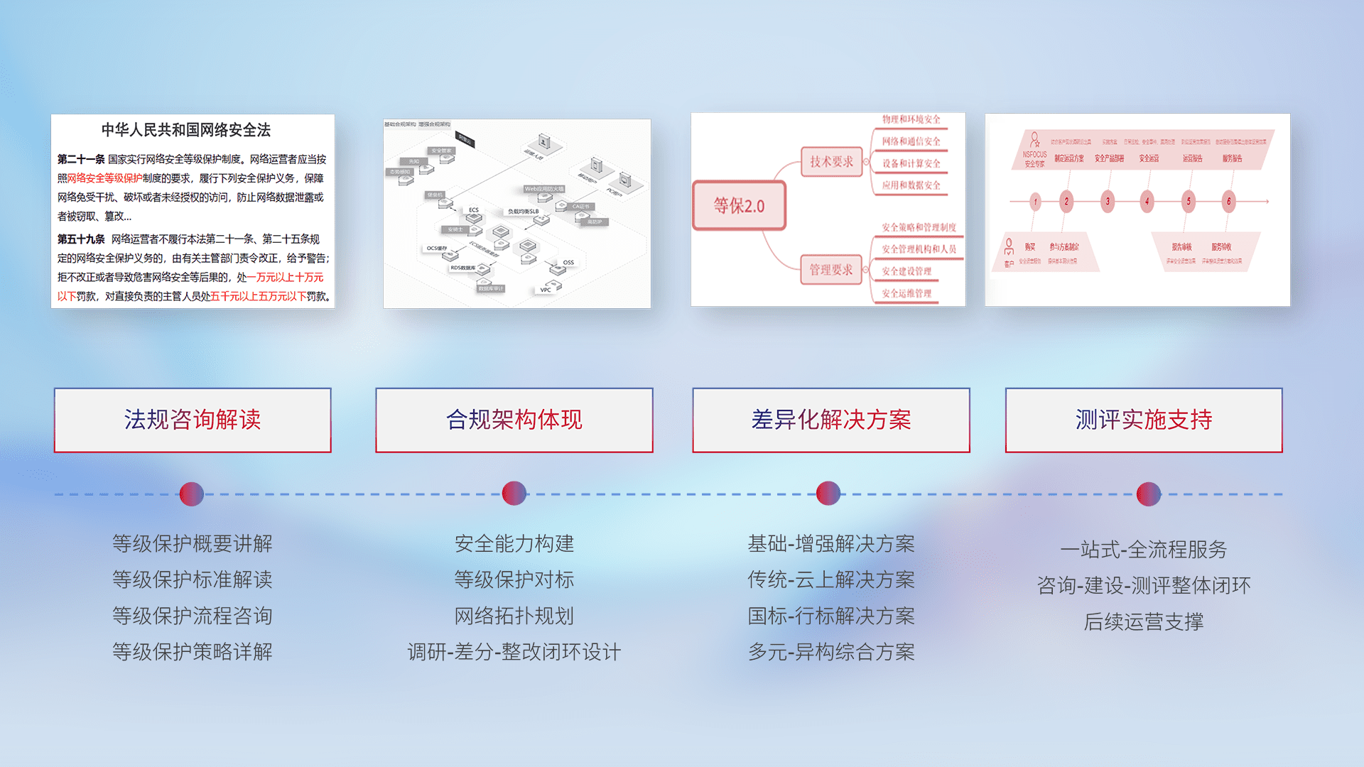 通过专业的法律咨询解读、、、合规架构体现、、、、差异化解决方案、、、、测试实施支持等服务,,为客户量身打造等保合规体系。。。。